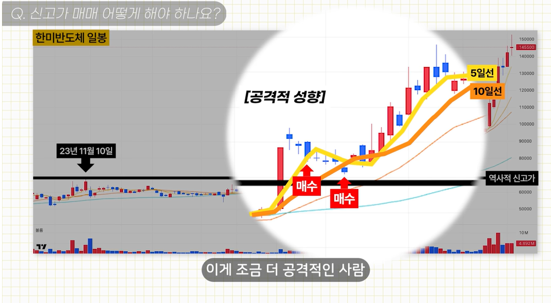 - 당일 신고가 돌파가 나온 상황이면 다시 하락하여 신고가 구간에서 지지받는 것을 확인하고 매수