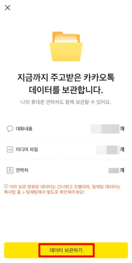 3. 저장할 대화내용, 미디어 파일, 연락처 갯수 확인 후  '데이터 보관하기' 클릭