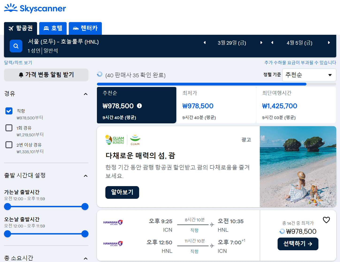 일반적으로, 출발 날짜가 가까워질수록 항공권 가격이 상승합니다. 가능하면 여행 계획이 확정되는 대로 빠르게 항공권을 예약하는 것이 좋습니다.