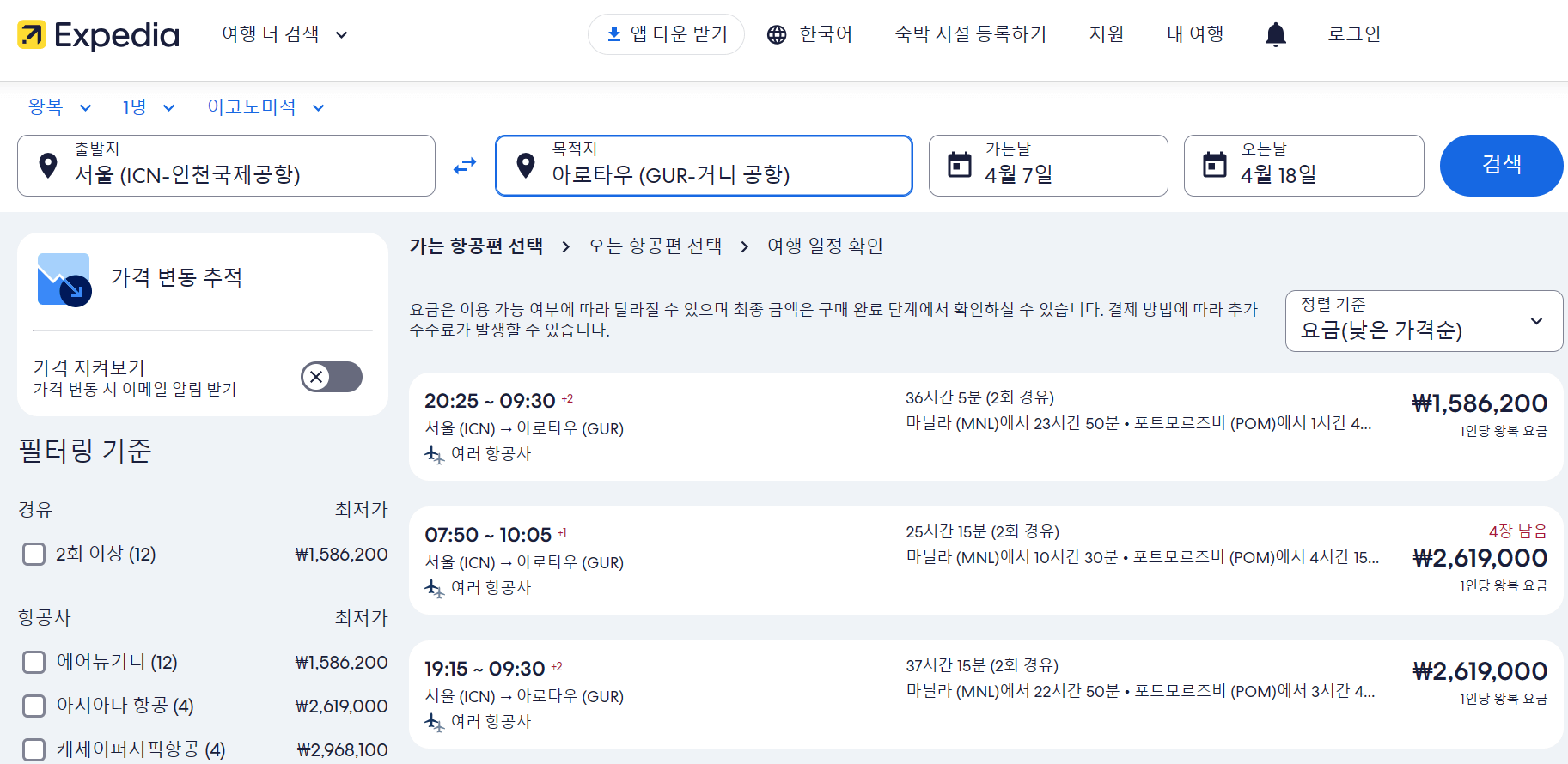 가격은 출발일과 도착일에 따라 크게 달라질 수 있습니다. 가능하다면 여행 일정을 유연하게 조정하여 가장 저렴한 항공권을 찾아보세요.